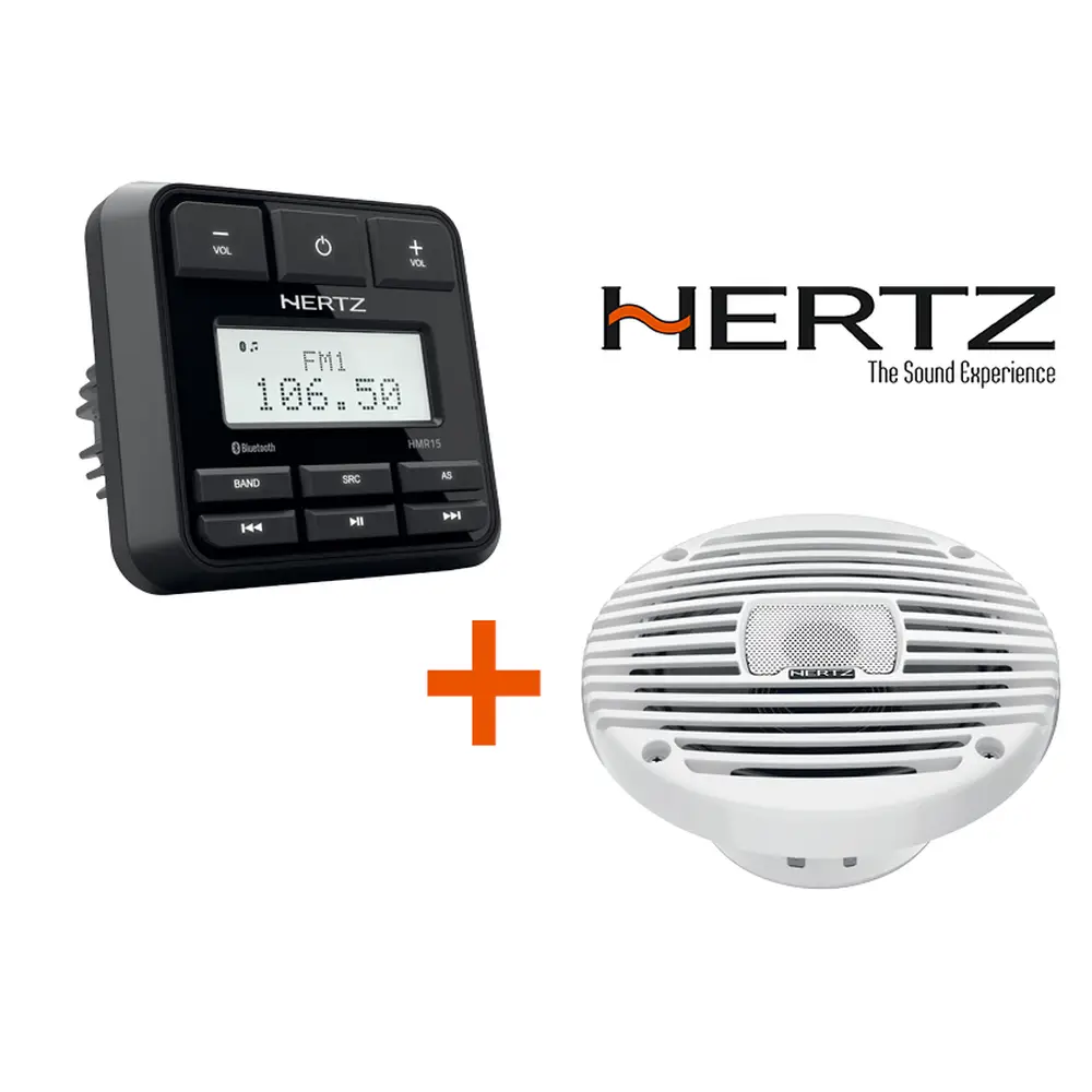 Hertz Marine Audio pack including the HMR15 head unit + Hertz Audio 6.5” Black speaker set. The Hertz Marine Audio Pack combines the compact HMR 15 head unit with a pair of rugged 6.5-inch black marine speakers, delivering powerful, crystal-clear sound built to withstand life on the water. The HMR 15 features Bluetooth streaming, USB and auxiliary inputs, and a built-in 4-channel amplifier, all housed in a weatherproof, UV-resistant design that fits neatly into a standard gauge opening.